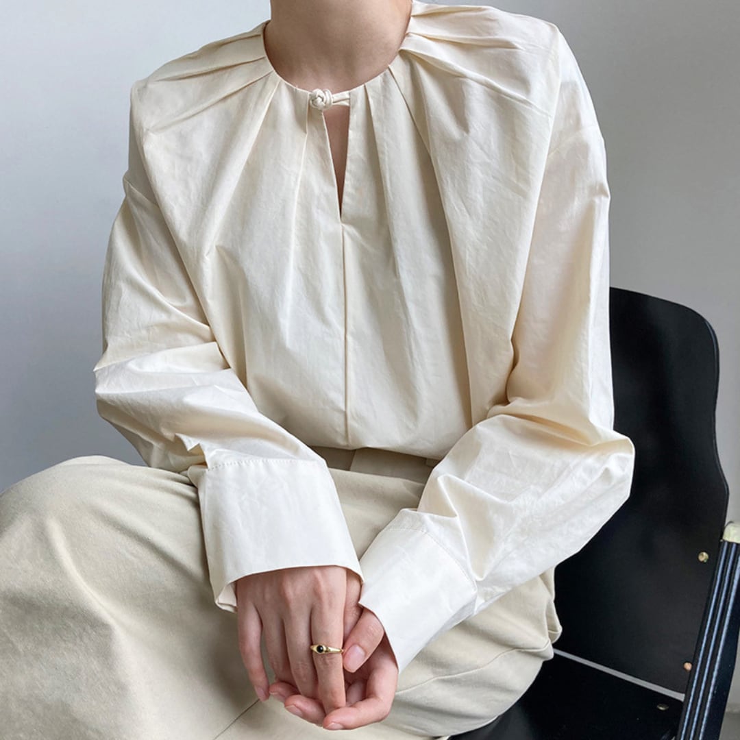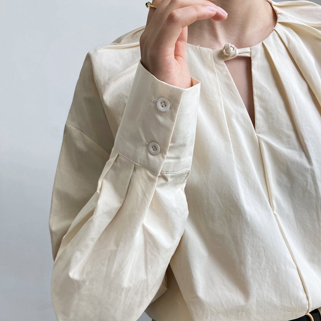 ネックラインに沿って施されたプリーツと、プラケットが魅力的なブラウス。